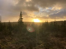 I set off at approximately 06:45 by touching the bridge and straight into the first short but steep climb of the day. It was quite windy but kept my coat packed away as I put some effort into the climb. I had a target in my head of about 5mph (12:30 minute miles) which would see me get around in 10 hours but conditions underfoot would be the ultimate make or break. That said, the first 6 miles or so of the route is on decent forestry tracks, with the hindrance of 1000ft of ascent. It was whilst climbing this forestry track that sun rose over the treeline so snapped a photo.